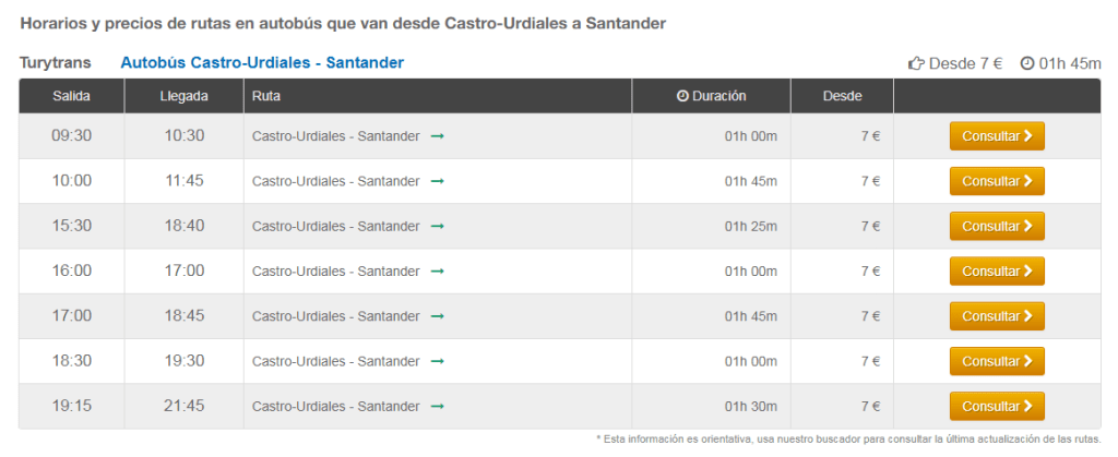 Tenemos el agravante de que saber algo tan esencial como los horarios no es tarea fácil. Cambian día a día y en la propia web de Alsa no hay un listado similar al de por ejemplo el Castrobus, tanto a Santander como a Laredo tienen esta carencia. El primer autobús para ir a Santander es a las 7:45 y llega a las 9:30, demasiado tarde. Por su parte, el último autobús es a las 18:30, horarios poco compatibles para ir a trabajar o para las primeras consultas médicas, ni tampoco para quien tenga un horario laboral que salga más 18:30 o para quien quiera a algún evento cultural, la mayoría son a partir de las 19h.